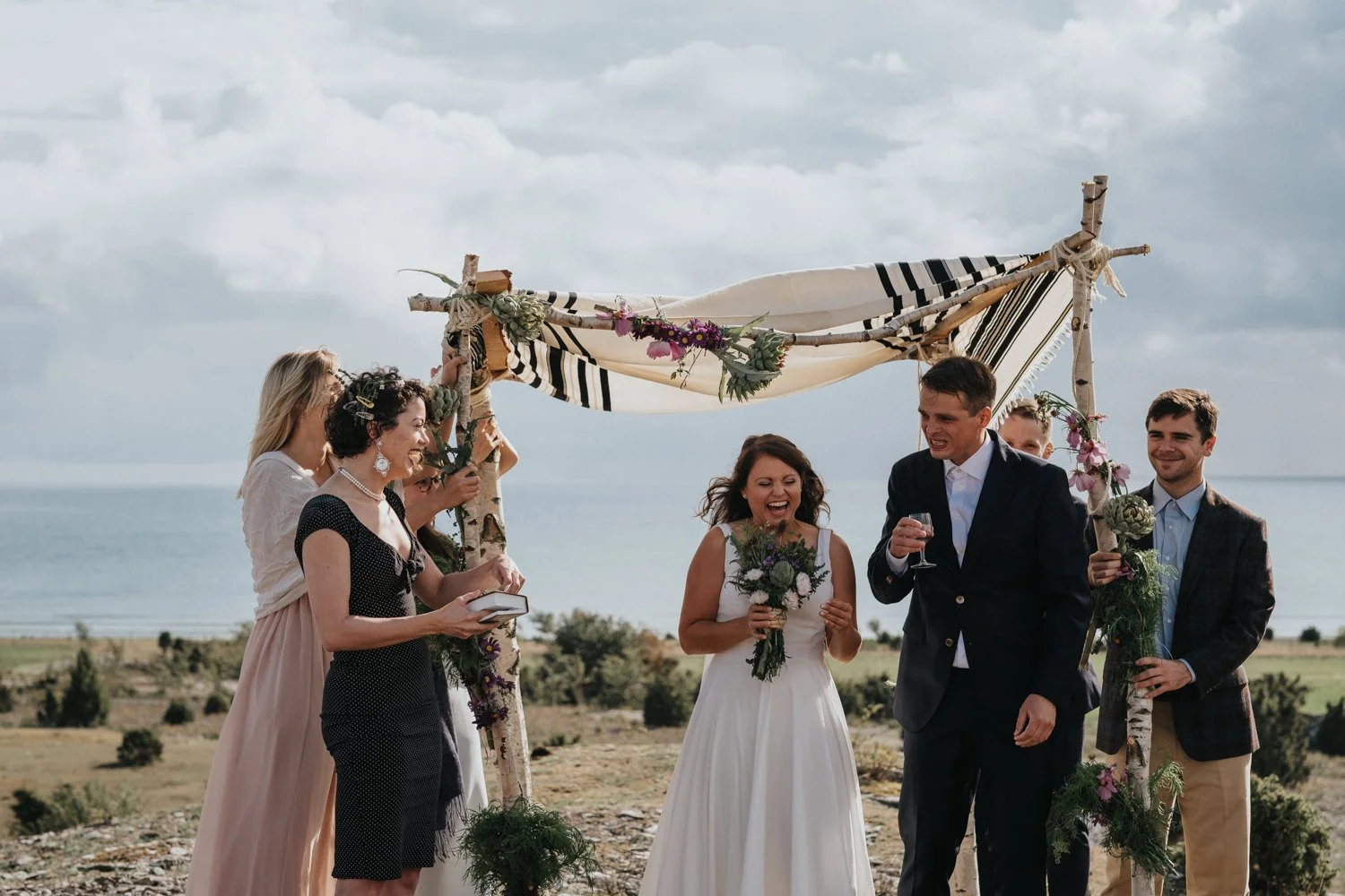 Massor av kramar och tårar senare började gästerna promenera tillbaka in till gården för mingel. Jag och brudparet tog vi en långsammare promenad för att fotografera porträtt längs vägen. Havet och det karga landskapet är något som får mitt hjärta att slå lite extra och en så fin inramning.